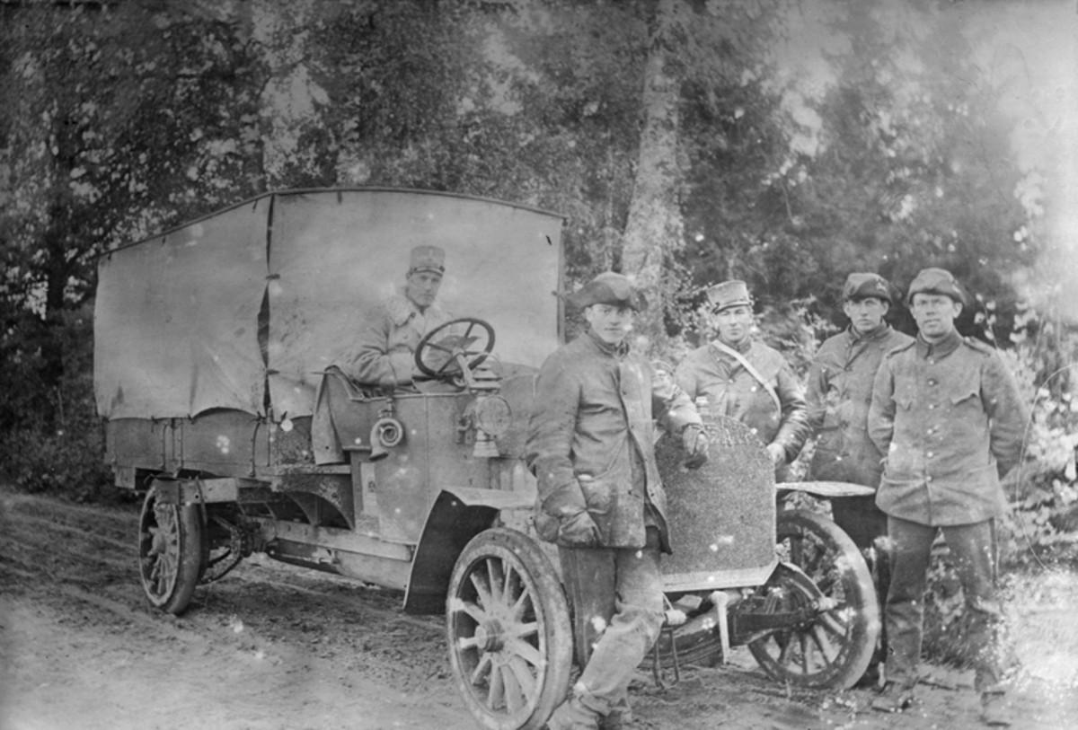 Porträtt av fem män vid en bil på Flygkompaniet på Malmen.