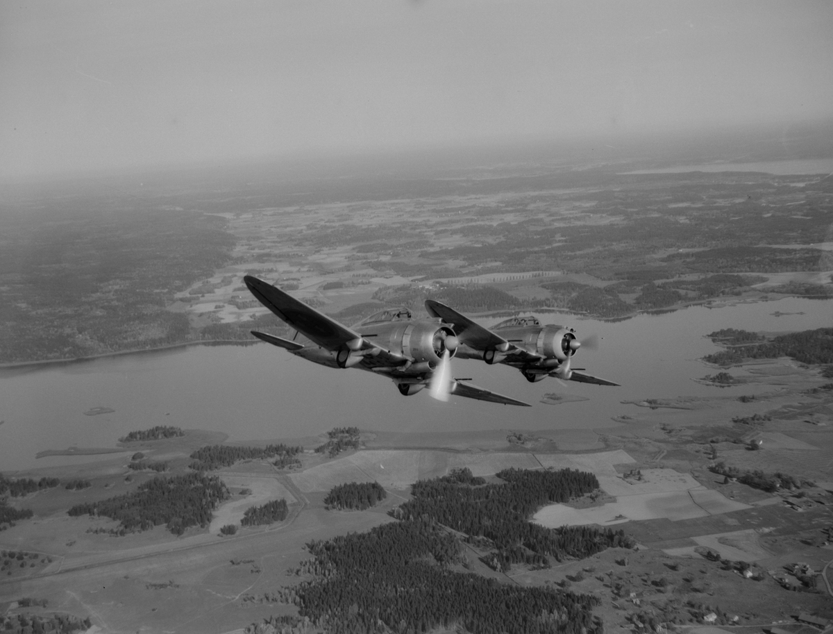 Två flygplan J 9 S från F 3 Malmen flyger i rote över sjön Roxen.