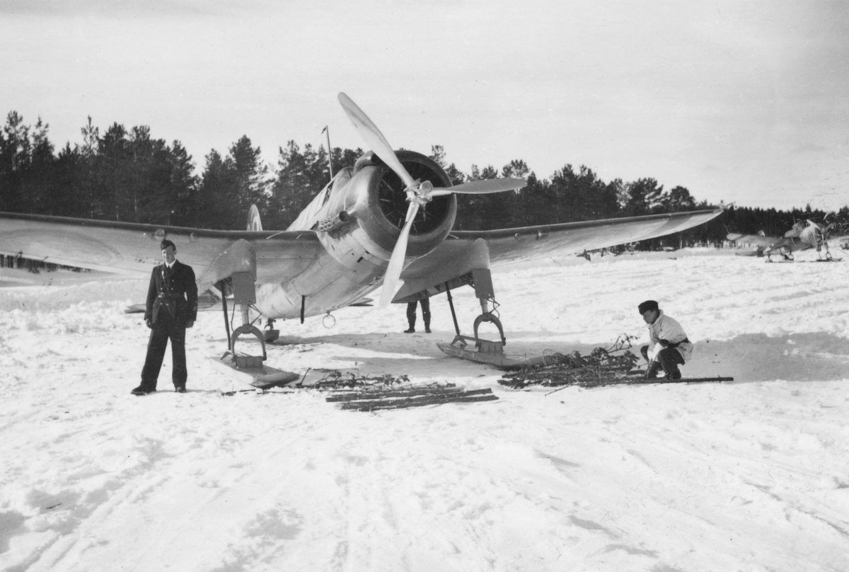 Flygplan S 17 utrustad med infällbart skidställ, på F 3 Östgöta flygflottilj, 1940-tal. Vintertid.