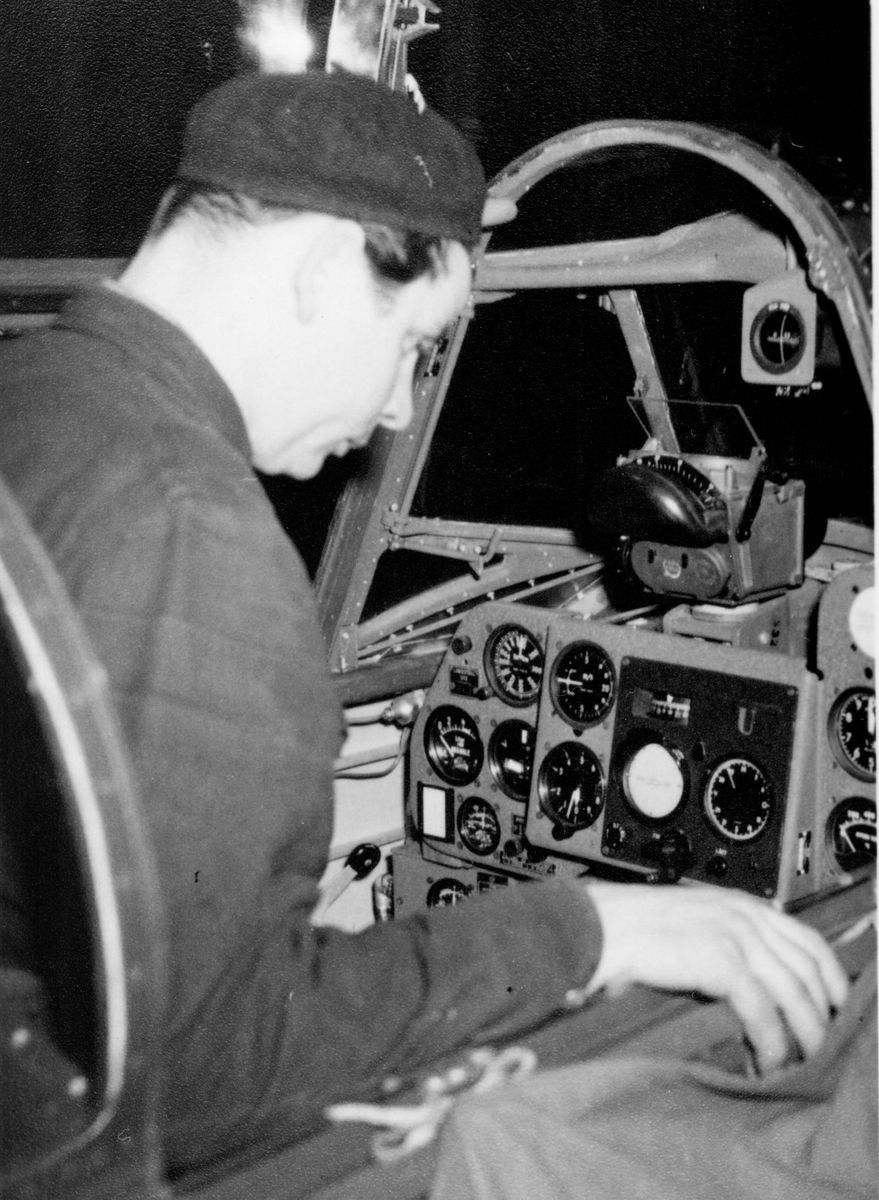 En flygplanstekniker sitter i förarplatsen på flygplan J 21R vid monteringsarbete.