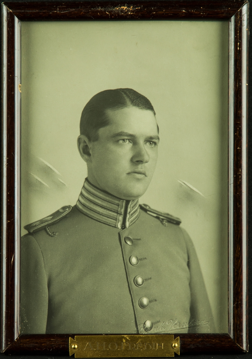 Porträttfotografi av militären A.H.O. Fredin, kompaniofficer på F 3 Östgöta flygflottilj.