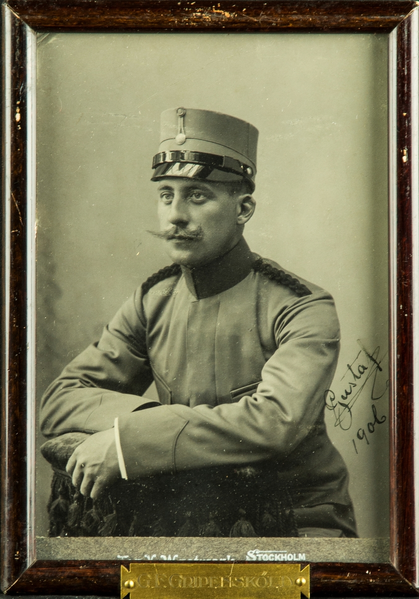 Porträttfotografi av militären Gustaf Gripensköld, kompaniofficer på F 3 Östgöta flygflottilj.