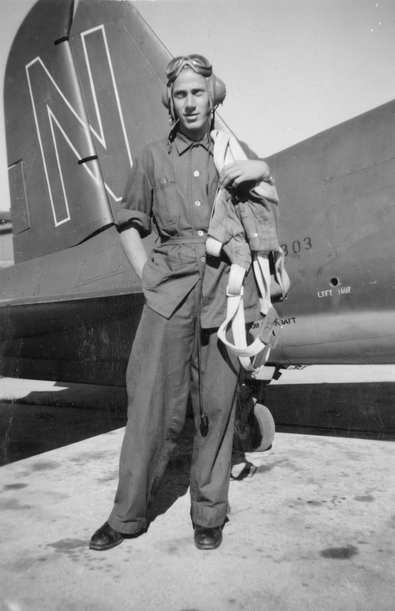 Porträtt. En flygarklädd man står vid stjärten på ett flygplan. En fallskärm hänger över axeln.