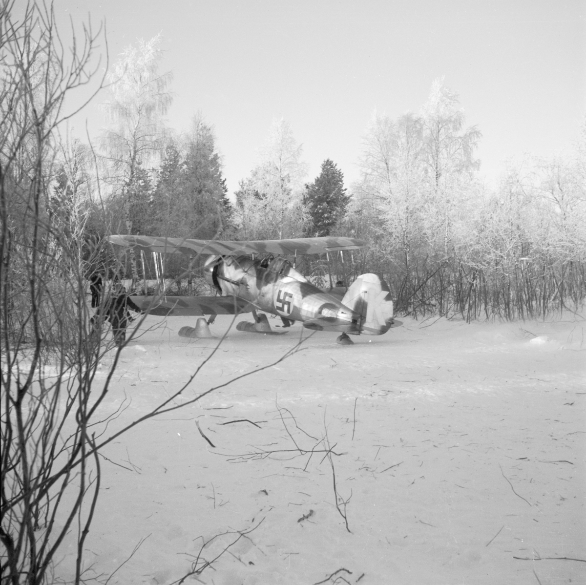 Flygplan Gloster Gladiator gul K vid F 19, Svenska frivilligkåren i Finland. Vy snett bakifrån.