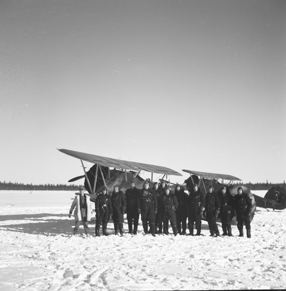 Gruppfoto av flygare från F 19 i Märkäjärvi vid Svenska frivilligkåren i Finland, F 19. I bakgrunden står två flygplan.