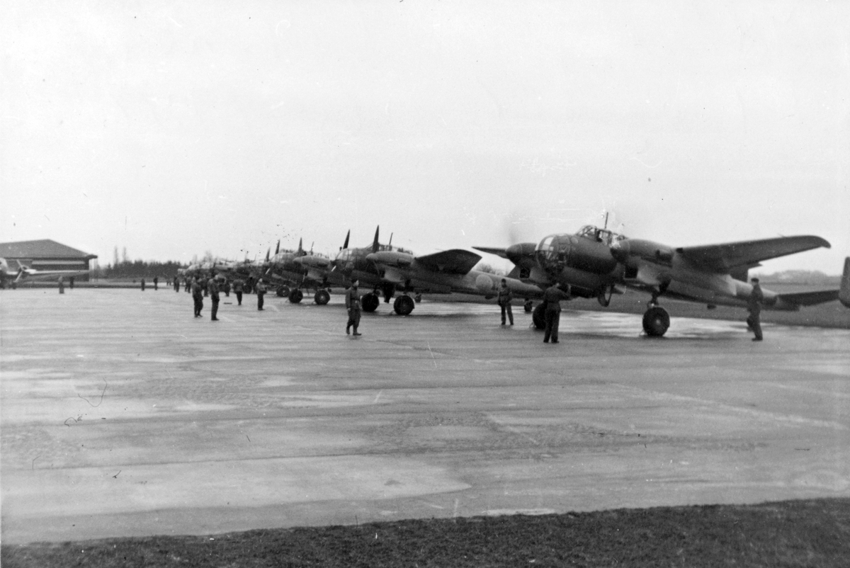 Daglig tjänst på F 14 Hallands flygflottilj, sent 1940-tal. Mekaniker i arbete med uppställda flygplan Saab B 18.