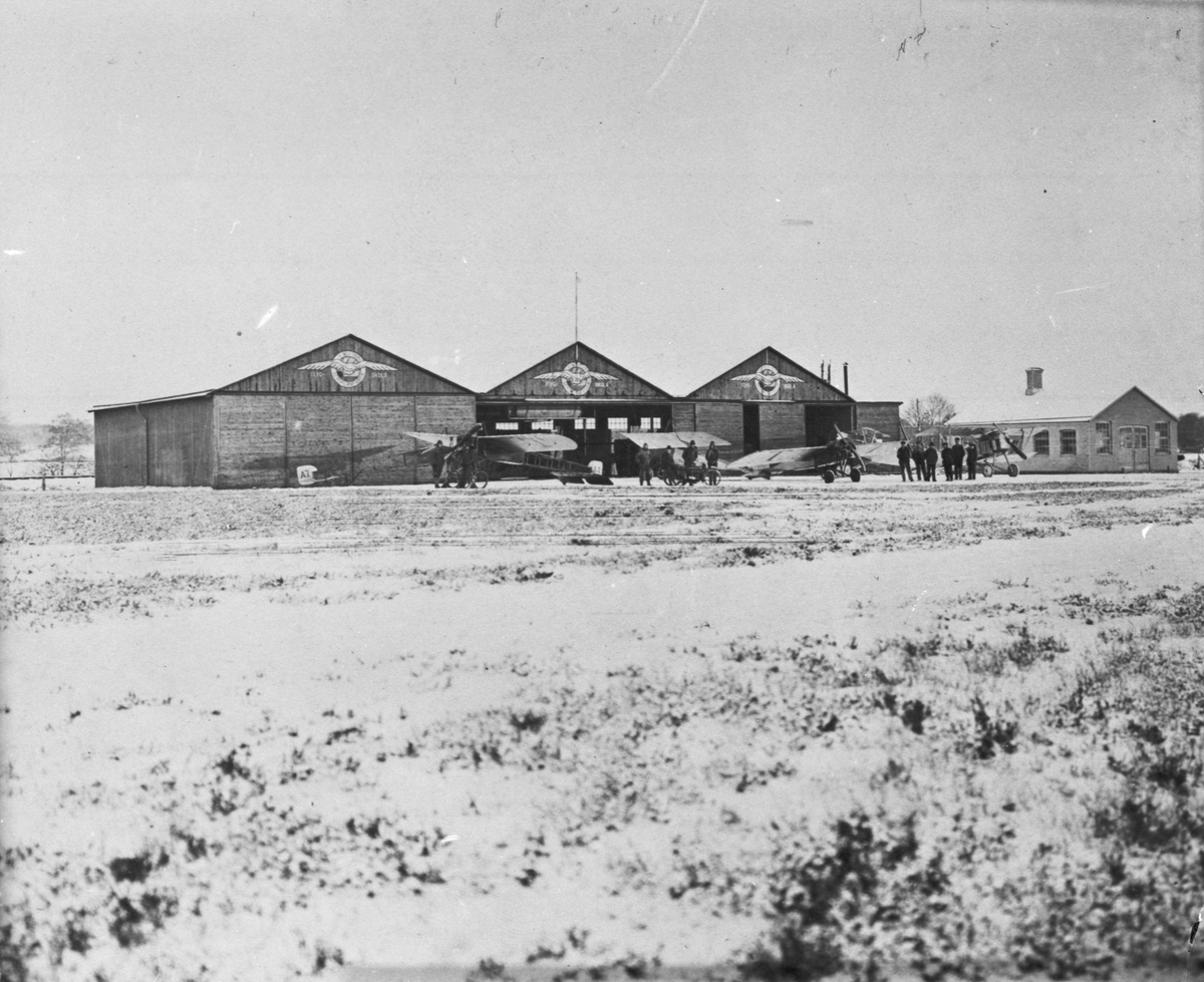 Exteriör av Thulins flygskola i Ljungbyhed med hangar och verkstäder, vintertid, omkring 1918. Från vänster står flygplan Thulin A nr 7, Thulin A nr 4, Thulin D, Thulin B samt två flygplan SW 15.