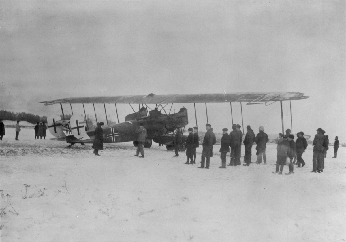 Folksamling kring Sveriges första bombplan, A.E.G GV, vid landning på flygfältet på Malmen i december 1918.