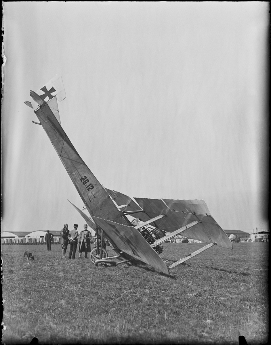 Militärt flygplan Hansa Brandenburg C.I märkt 26.12 tillhörande Österrike-Ungern har landat på nosen på ett flygfält. Vy från sidan. I bakgrunden syns byggnader och militärer.