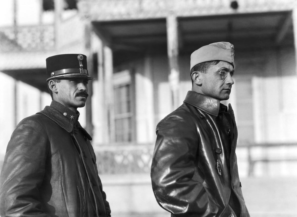 Gruppfoto av två militära flygare från Österrike-Ungern. Profilbild. Byggnad i bakgrunden.