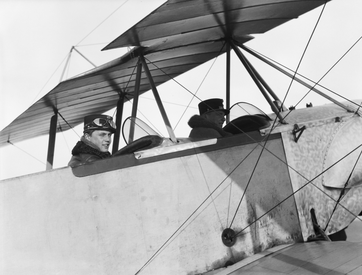 Två militära flygare från Österrike-Ungern sitter i flygplan under första världskriget. Vy snett från sidan.