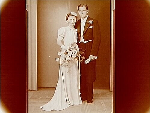 Ingrid Lindskog och Erik Westlund. Bröllopsfoto, brudpar.