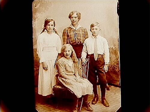 Familjegrupp, en kvinna, två flickor och en pojke.