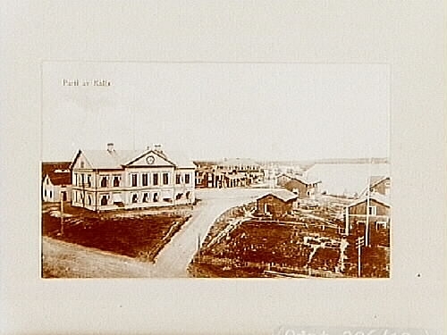 Parti av Kalix, tvåvånings bostadshus med frontespis till höger på bilden, flera mindre bostadshus i bakgrunden.