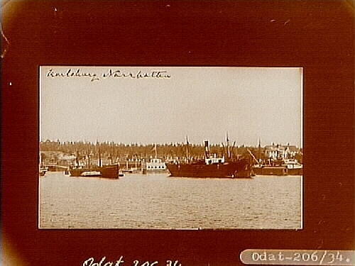 Karlsborg, parti från hamnen, tre ångfartyg.