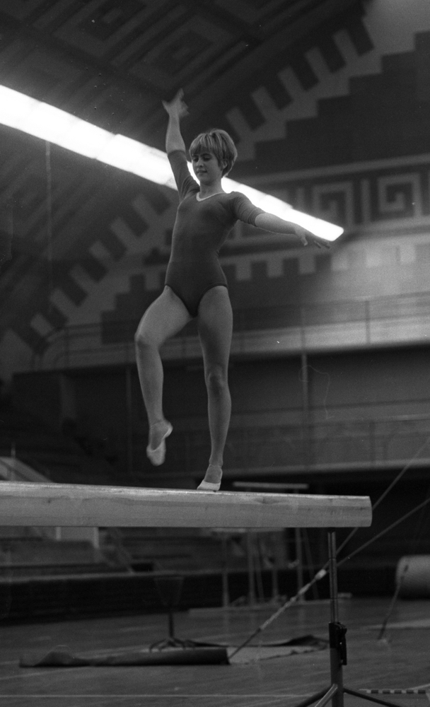 Gymnasten Kicki Jedbäck går balansgång på en bom.