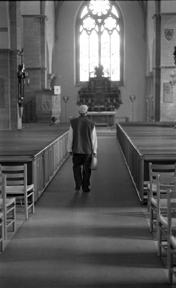 Man i arbetskläder i Nikolaikyrkan.