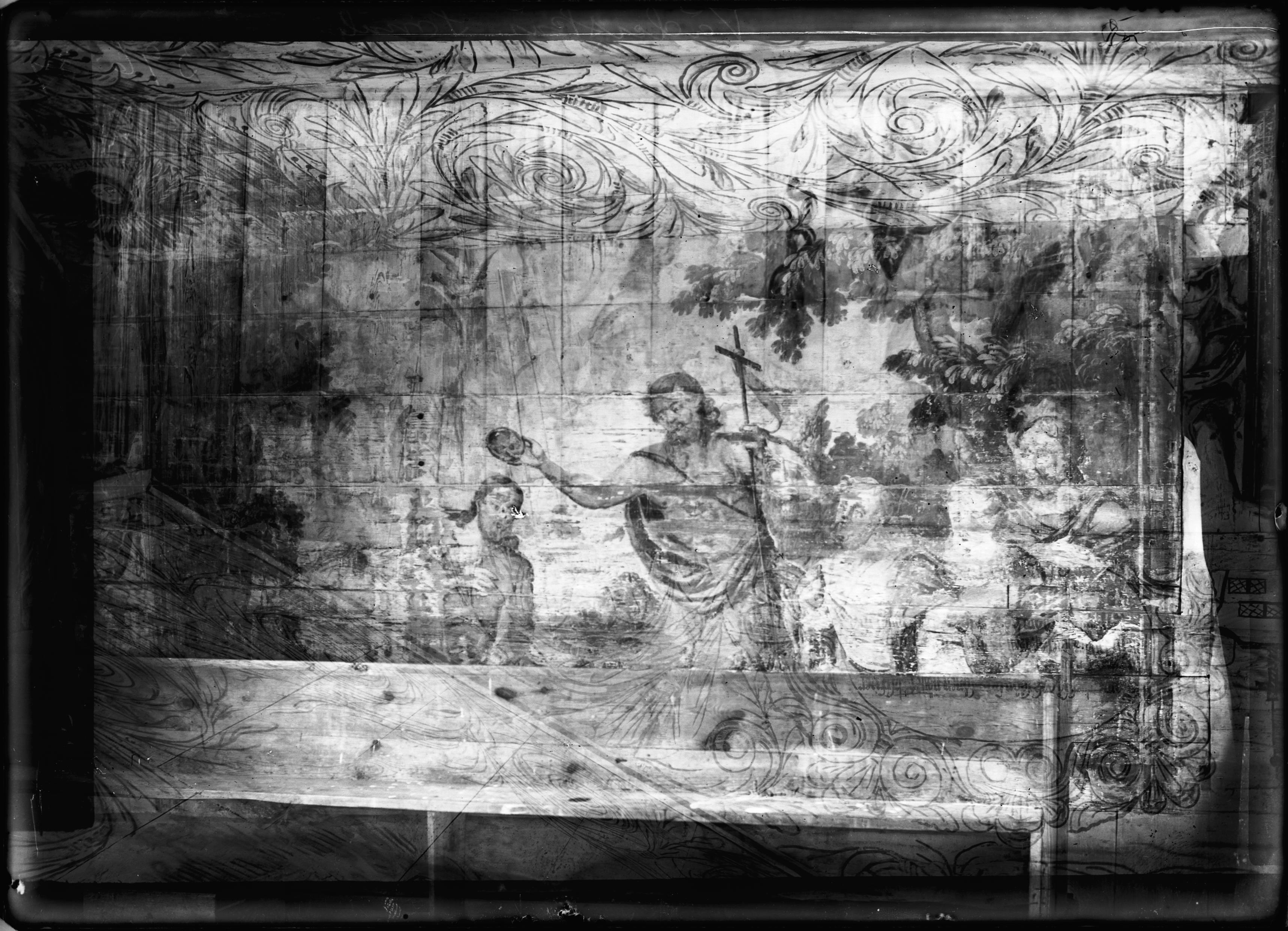 Beskrivning: Målningar på vägg. Före restaurering 1924.