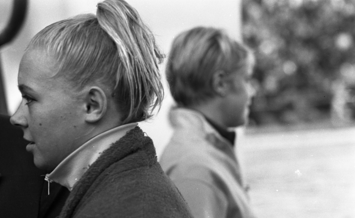 I förgrunden står en flicka med uppsatt hår. Runtomkring henne står andra personer.