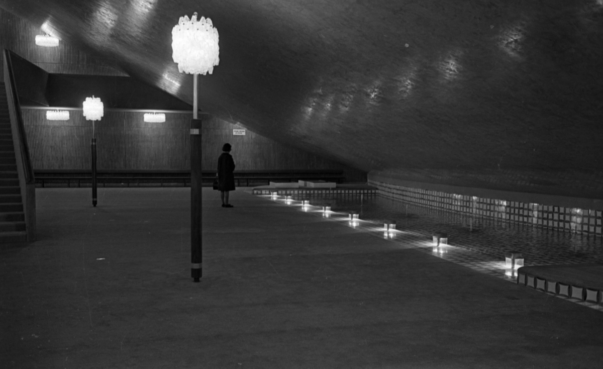 Kvinna stående i foajén på Hjalmar Bergmanteatern. Belysning i vattenbassäng.