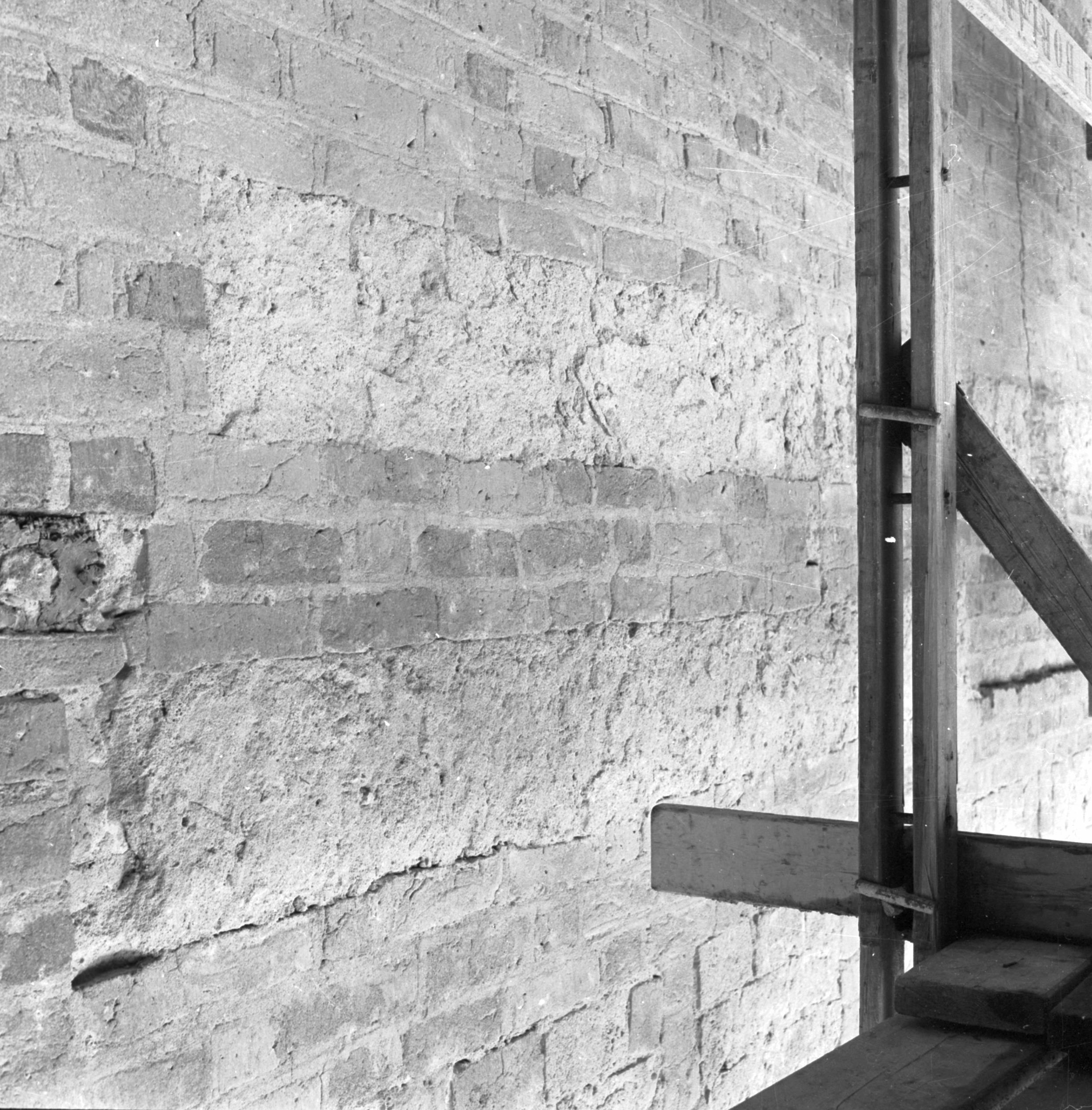 Blinderingsbanden på tornets västra sida fotograferade i ordning uppifrån och nedåt. Byggnadshistorisk undersökning i samband med omputsning 1963. Foto nr. 20.