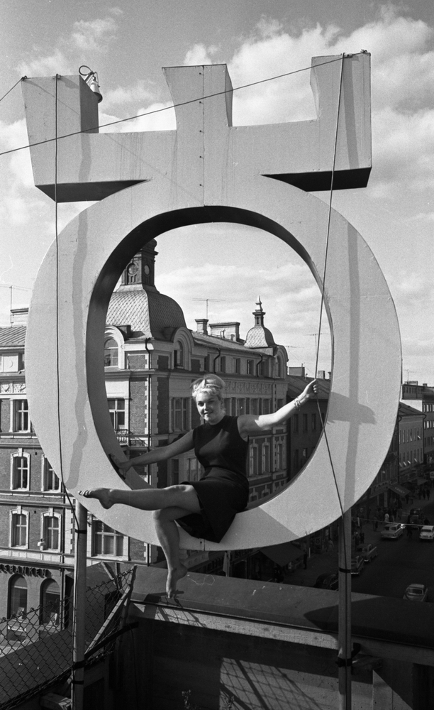 Fotomodell sitter och viftar med benen i Örebros logga ett krönt Ö