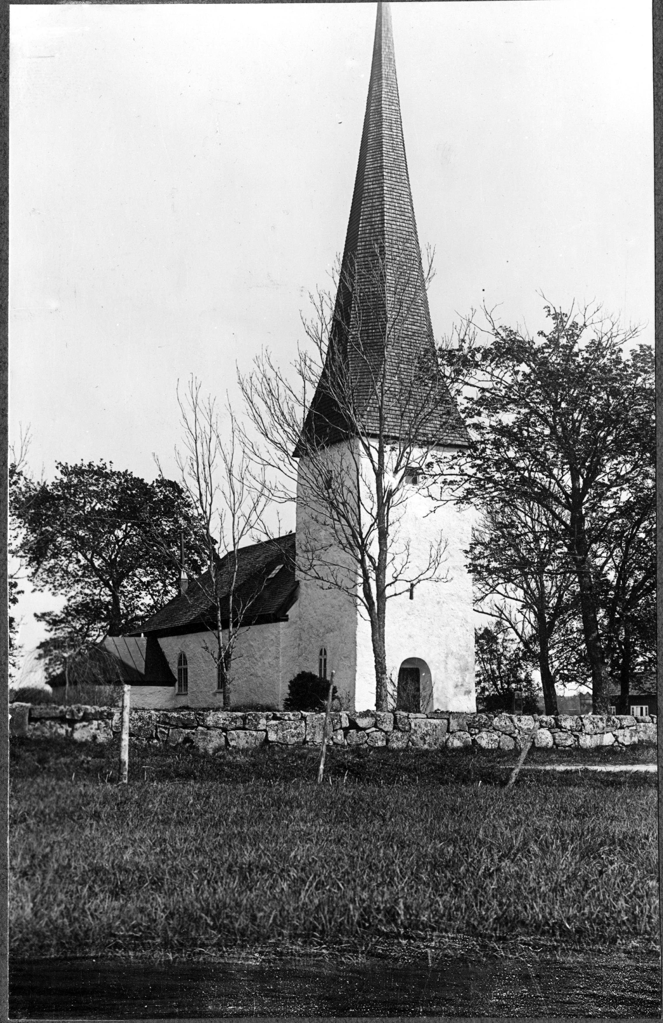 Kyrkan från nordväst. Medeltidskyrka med enskeppigt långhus och lågt torn med hög tornspira.