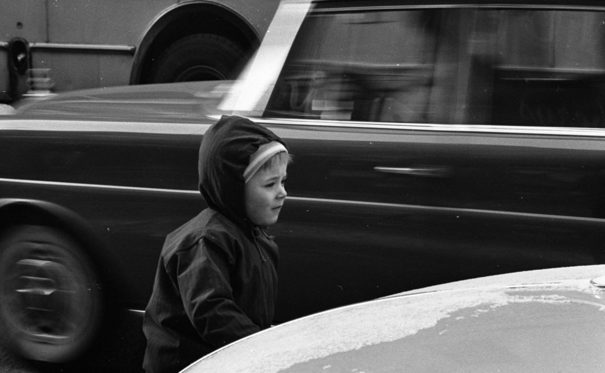Barn tittar ut bakom bil för att kunna passera trafikerad gata