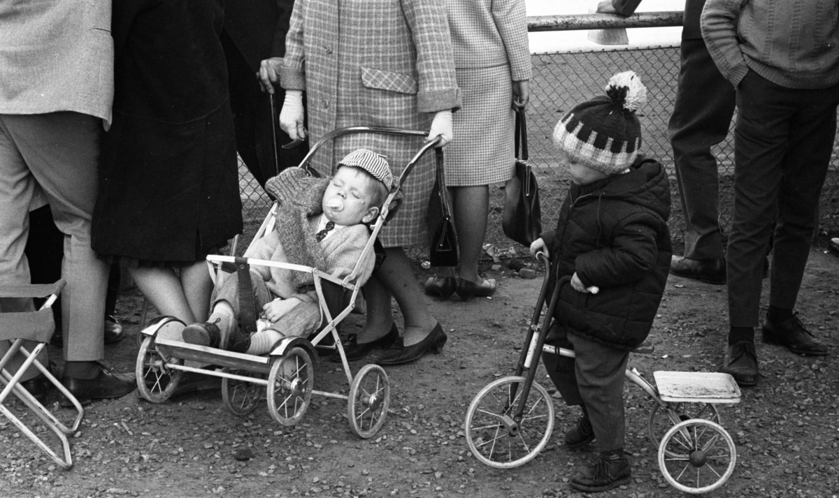 Barn, i barnvagn och på trehjuling, i publik vid travtävling