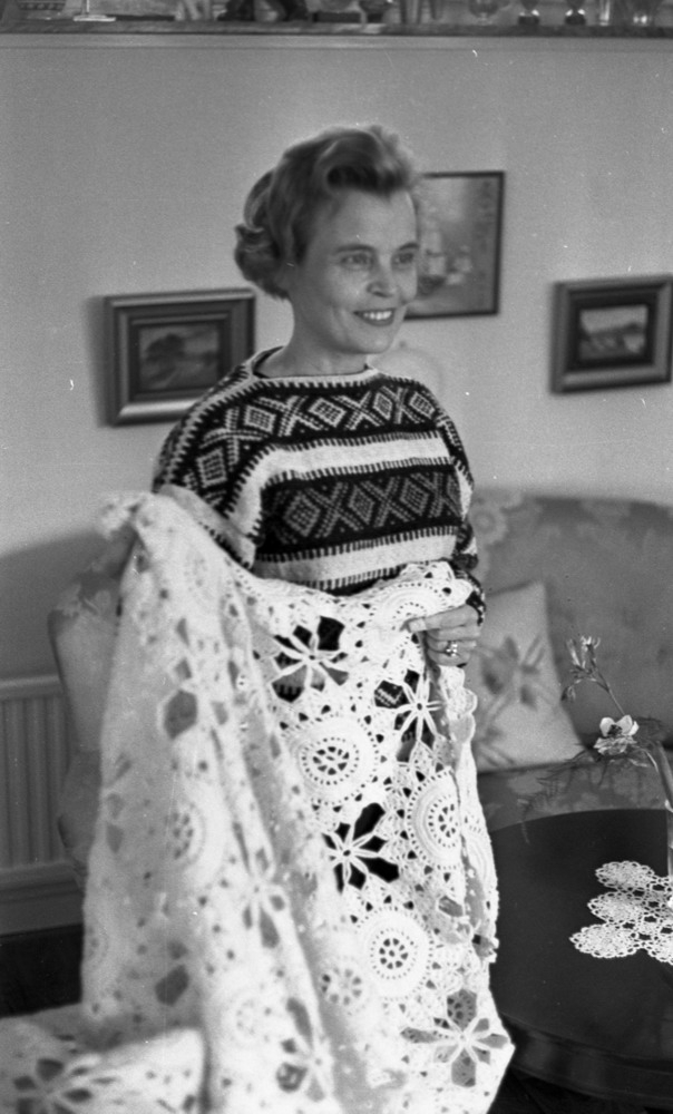 Fru Göthell visar ett hemvirkat sängöverkast.
