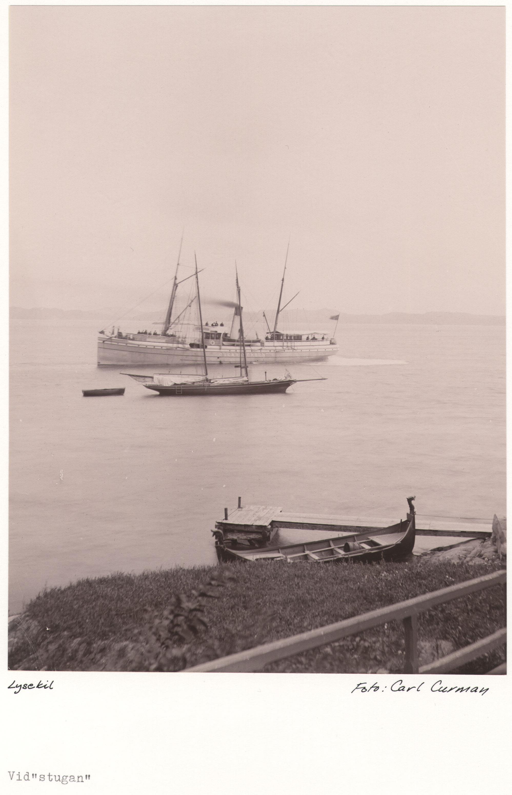 Ångbåten Oscar Dickson och andra båtar på Gullmarn (Gullmarsfjorden) vid "stugan" - en av Carl Curmans två villor i Lysekil.