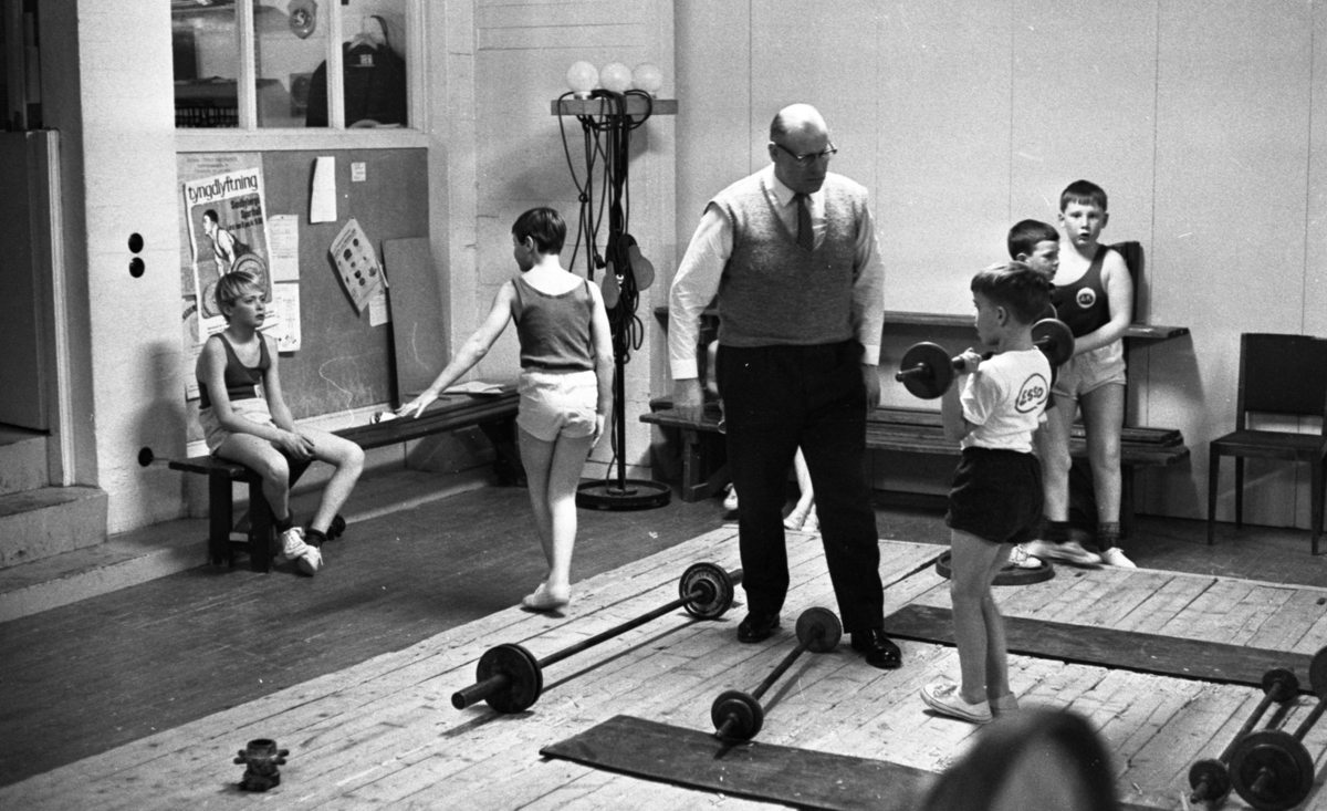 En tränare, en äldre man, klädd i skjorta, slips, väst, byxor och skor instruerar en liten pojke i åttaårsåldern som har lyft upp en skivstång i axelhöjd. Den lille pojken är klädd i T-shirt, shorts och träningsskor. Fyra andra skivstänger ligger på golvet. I bakgrunden sitter en pojke på en bänk och tre andra pojkar står upp. Två avlånga träningsmattor ligger på golvet.