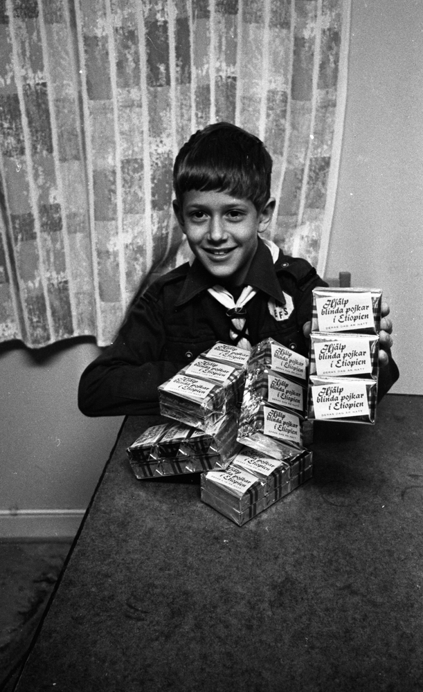 Pojkscout säljer tvål till förmån för blinda barn i Etiopien.