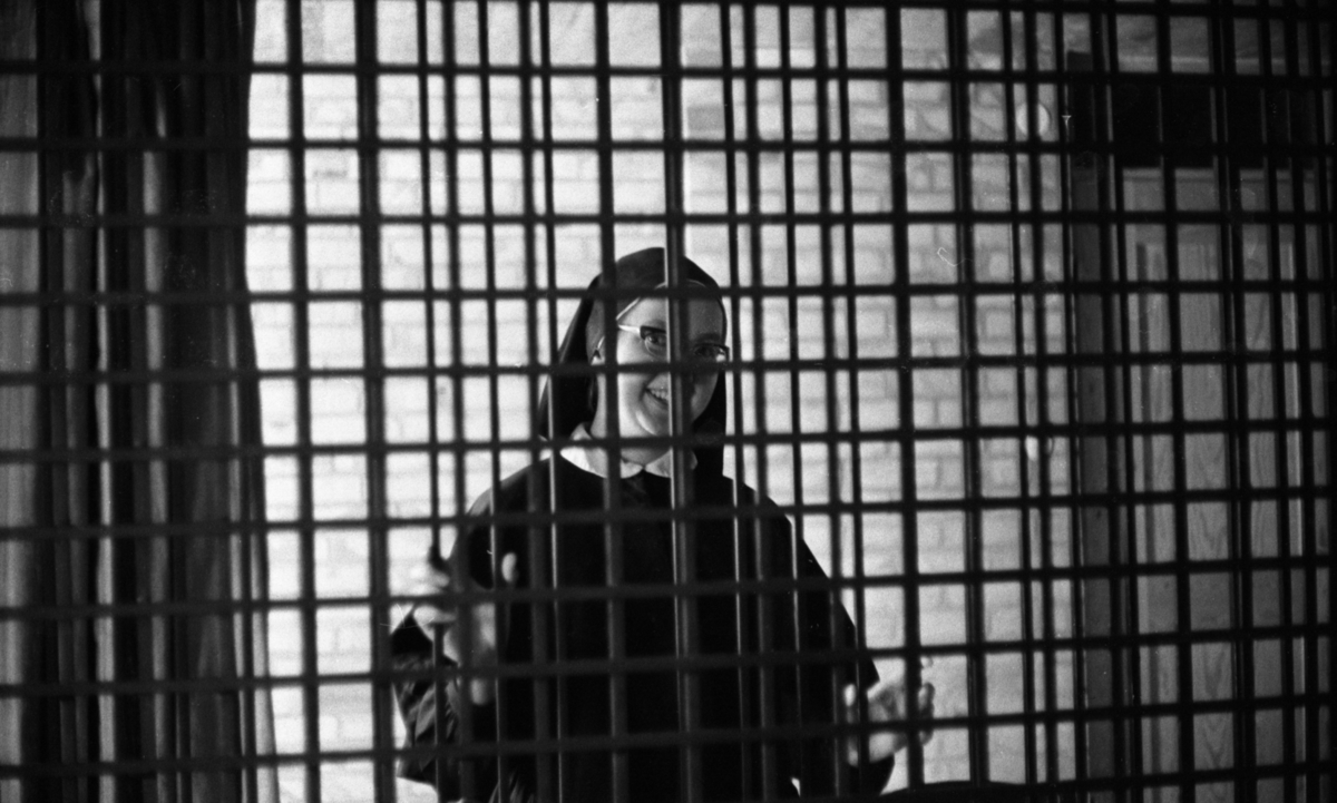 Närbild på en ung nunna klädd i dok och dräkt. Hon bär glasögon och står bakom galler.