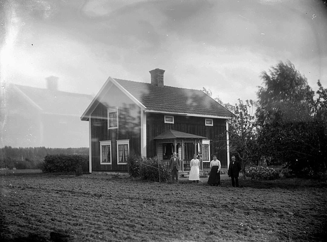 Bostadshus, familjegrupp fyra personer framför huset.