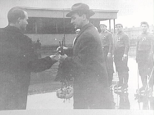 Lasse Åkerström ÖSK. Lagledare mottager blommor och hederstecken av Köpings IS ordf på grund av ÖSKs 40 års jubileum.