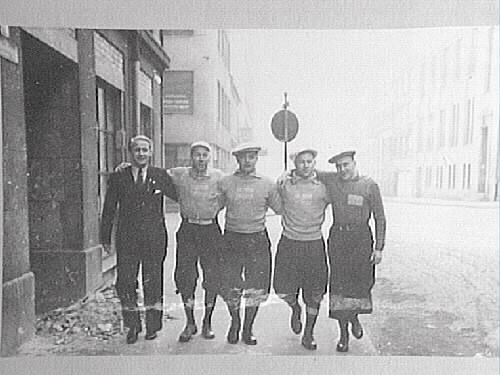 403:Lagledaren ( ÖSK) vandrar med sina lagkompisar i Oslo (Norge) , Örebroarna frv lagl.S.Fogelgren, Tjappe Magnusson, Jojje Gustafsson, Olle Sääv och målvakt K.J Ekberg.