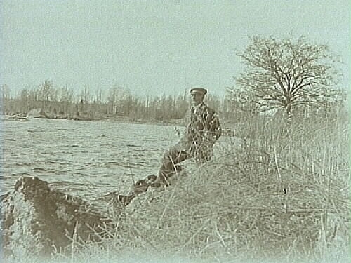 Herr Larsson står och tittar ut över en sjö (Oppäsen)