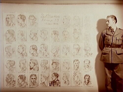 Gösta Pettersson (Kumla) vid karikatyrteckningar på personer i andra pluton, 8:e kompaniet I3. (18 dec 1941).