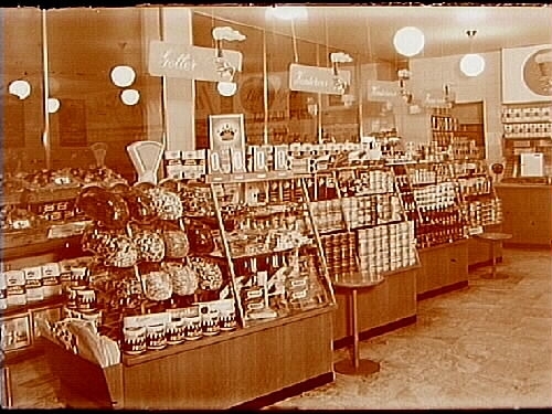 Konsum, affärsinteriör, konserver, gotter m. m.