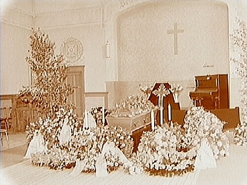 Begravning med blommor och kista, i begravningsföreningens regi.