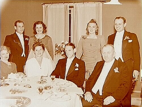 Brudpar till bords omgivet av sex bröllopsgäster.