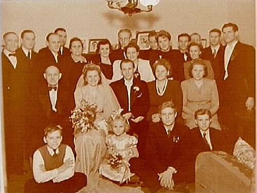 Interiör, bröllop, brudpar omgivet av ett tjugotal bröllopsgäster.