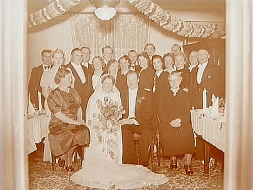 Titel: Bröllop, brudpar och bröllopsgäster inomhus.