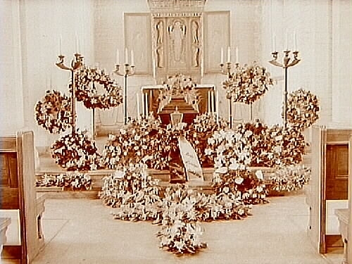 Kyrkointeriör, kista med blommor.