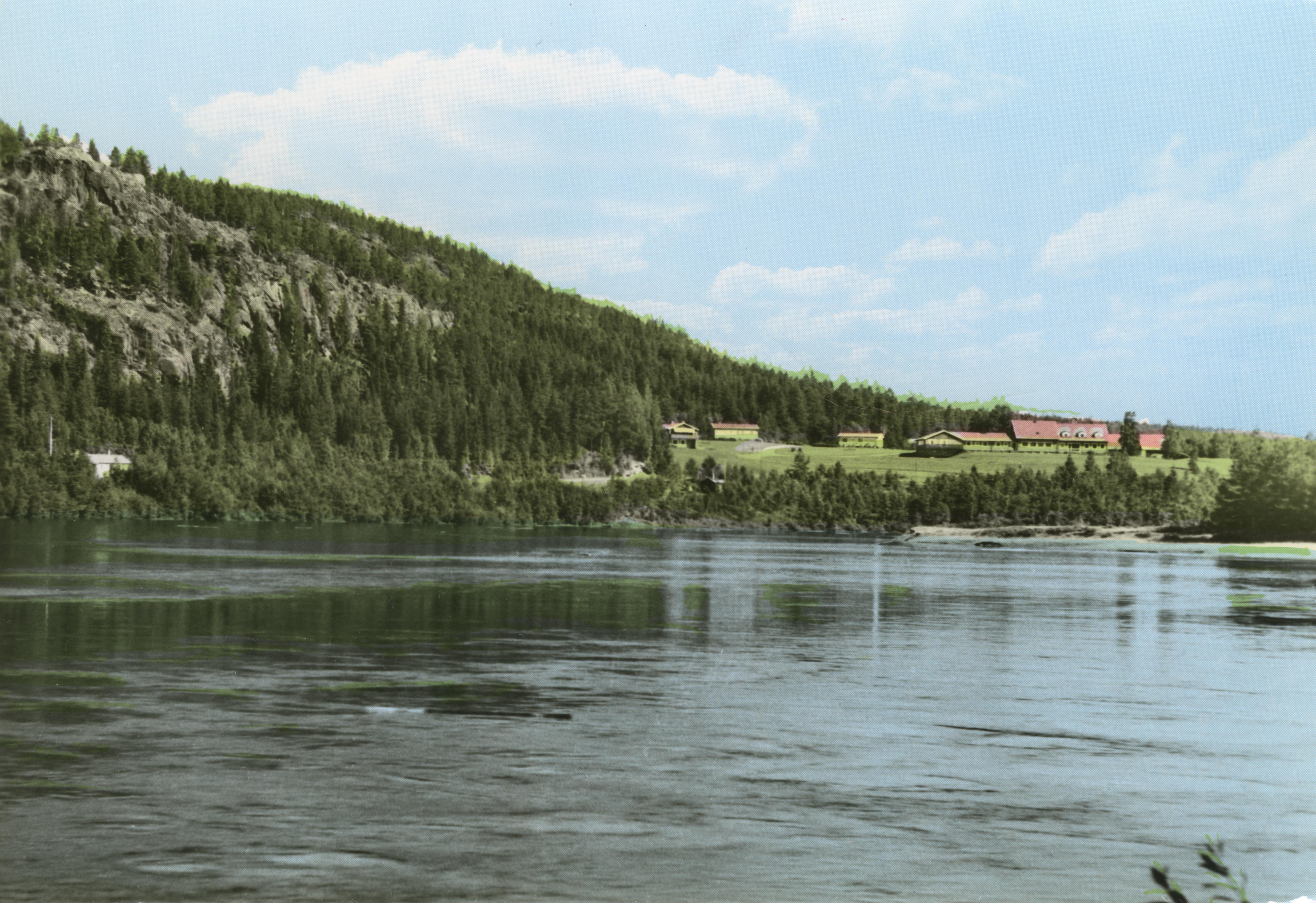 Piteälv vid Hundberget med skogsskolan. Handkolorerad variant av ac01034.