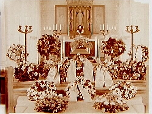 Kyrkointeriör, begravning, likkista och begravningskransar.