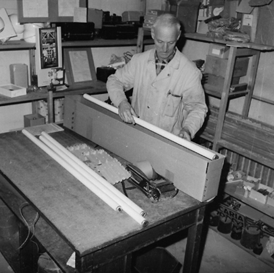 Titel: Oscaria Skofabrik, interiör, en man. Bilden tagen för personaltidskriften Sko Bandet.