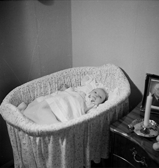 Rumsinteriör, en baby i vaggan.