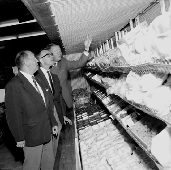 Konsum, affärsinteriör, tre män vid kyldisken.